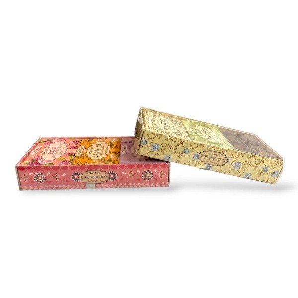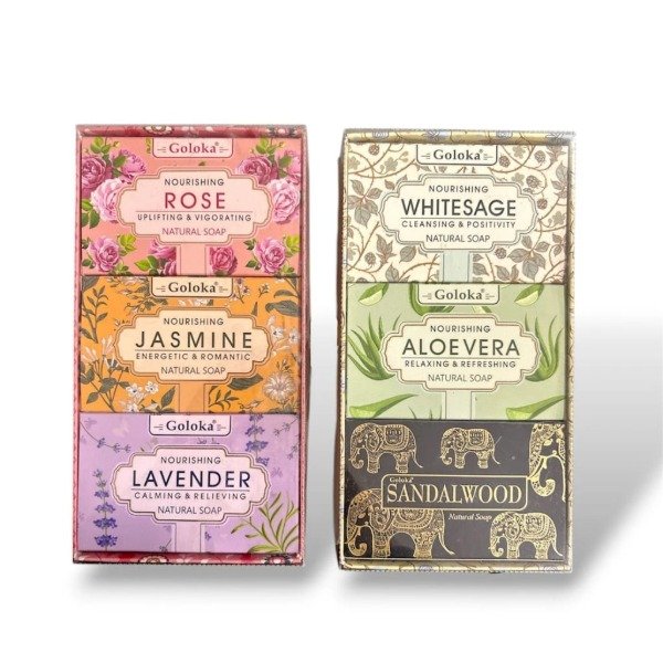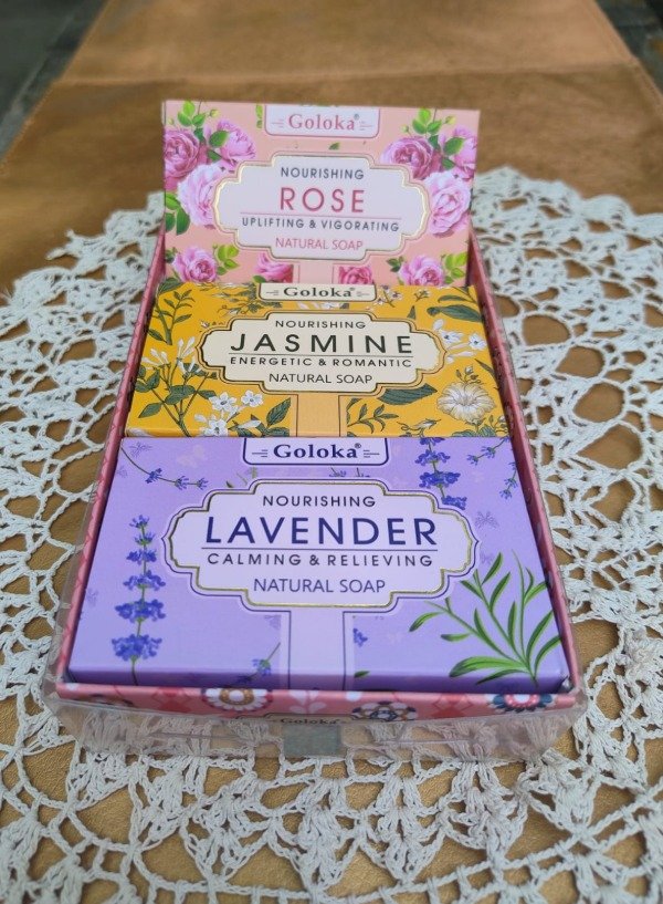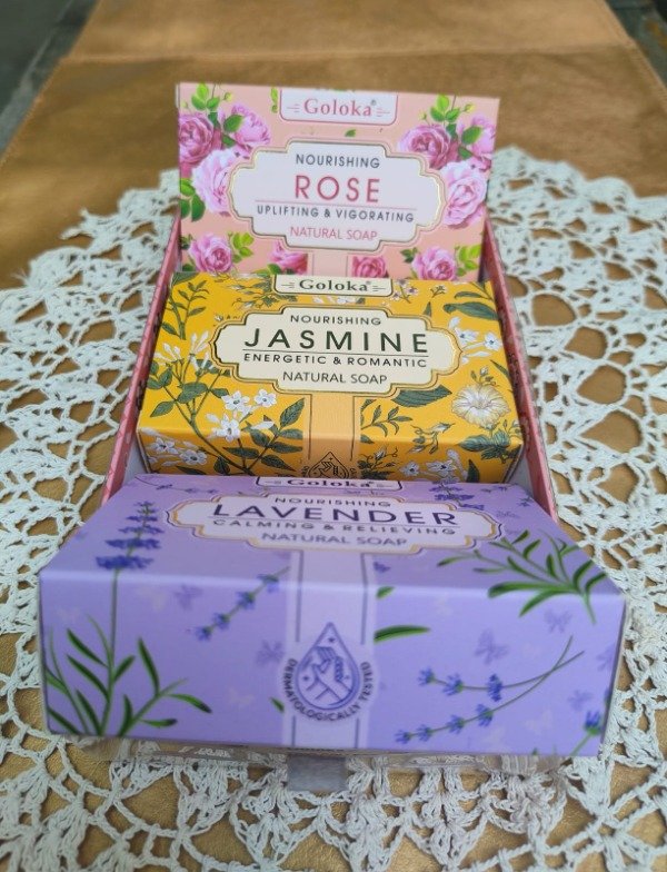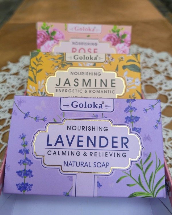 Combo de 2 jabones en barra Goloka, con fragancias naturales (jazmín, rosa, lavanda y más) que aportan calma, tranquilidad y renovación energética.