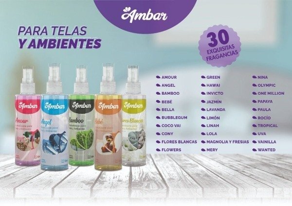 Aromatizante en spray para telas y ambientes de la marca Saphirus/Ámbar, no mancha.